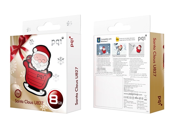 Компания PQI выпустила эксклюзивную ограниченную серию новогодних флэш-карт. Модель Intelligent Drive U827 в преддверии наступающего Нового Года и Рождества выполнена в виде фигурки Санты-Клауса. Кроме весёлого дизайна, флэшка является водостойкой, пылеотталкивающей и ударопрочной, притом его внешняя отделка сделана из мягкой и эластичной резины.
